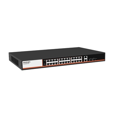 SSDCAM POE-624PSO POE-коммутатор 24-х портовый 1000 Мбит/сек RJ-45 с поддержкой Auto-MDIX, PОE, + 2 порта 100/1000Mbps RJ-45 Uplink + 2 порта SFP, возможность установки в 19U стойку, на порт 48V Max.,до 30Ватт на порт (IEEE 802.3af/at POE+) исходя из общей мощности РОЕ, общая мощность 400W на систему, AC-220V (встроенный блок питания, 440 x 280 x 44 мм, 4000 гр. Усиление передачи данных до 250 метров, путем снижения пропускной способности до 10Мбит/сек на каждый РОЕ порт, кроме портов Uplink.